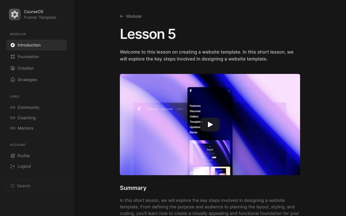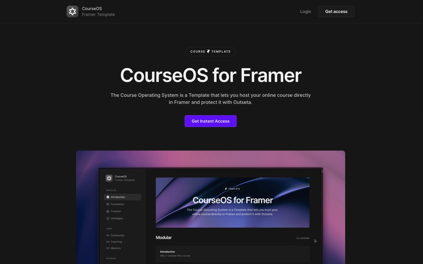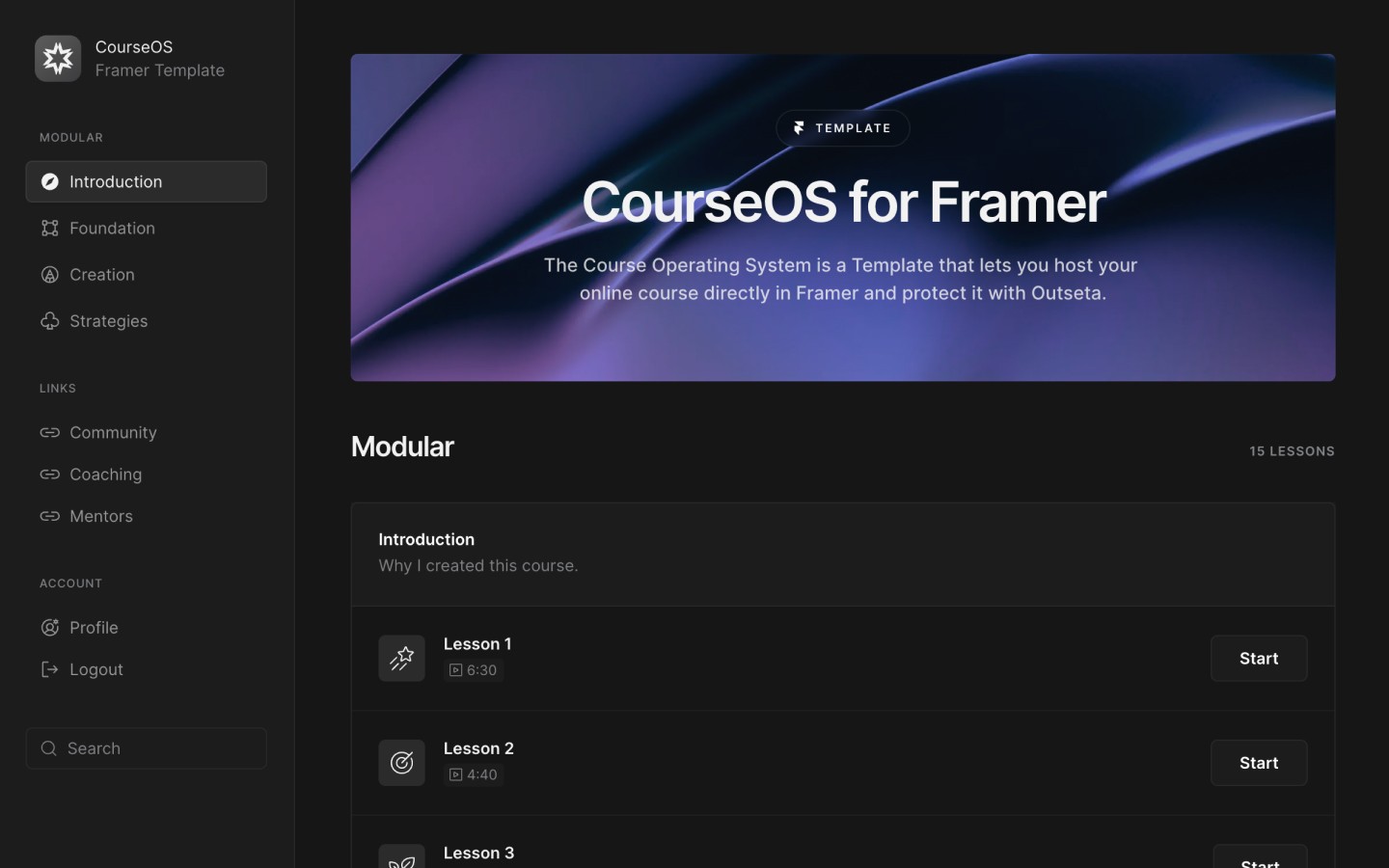 CourseOS is a one-time purchase. You own the site, the design, the student experience, everything. Outseta handles auth, payments, CRM, and email in the background, so you get enterprise-grade infrastructure for a simple monthly fee. Each lesson is its own Framer page, which means you're not fighting a locked editor to make your course feel like you — it already does.