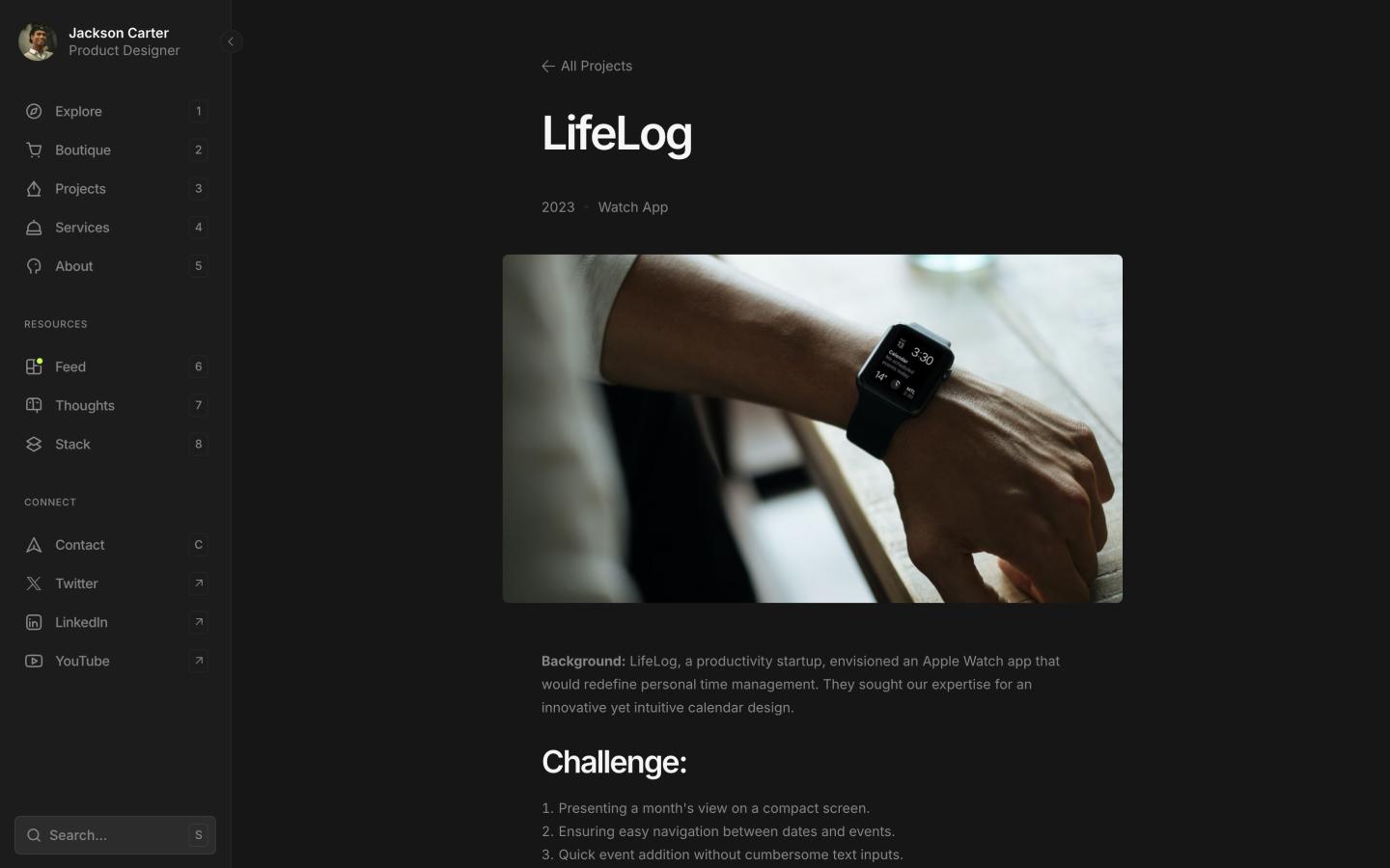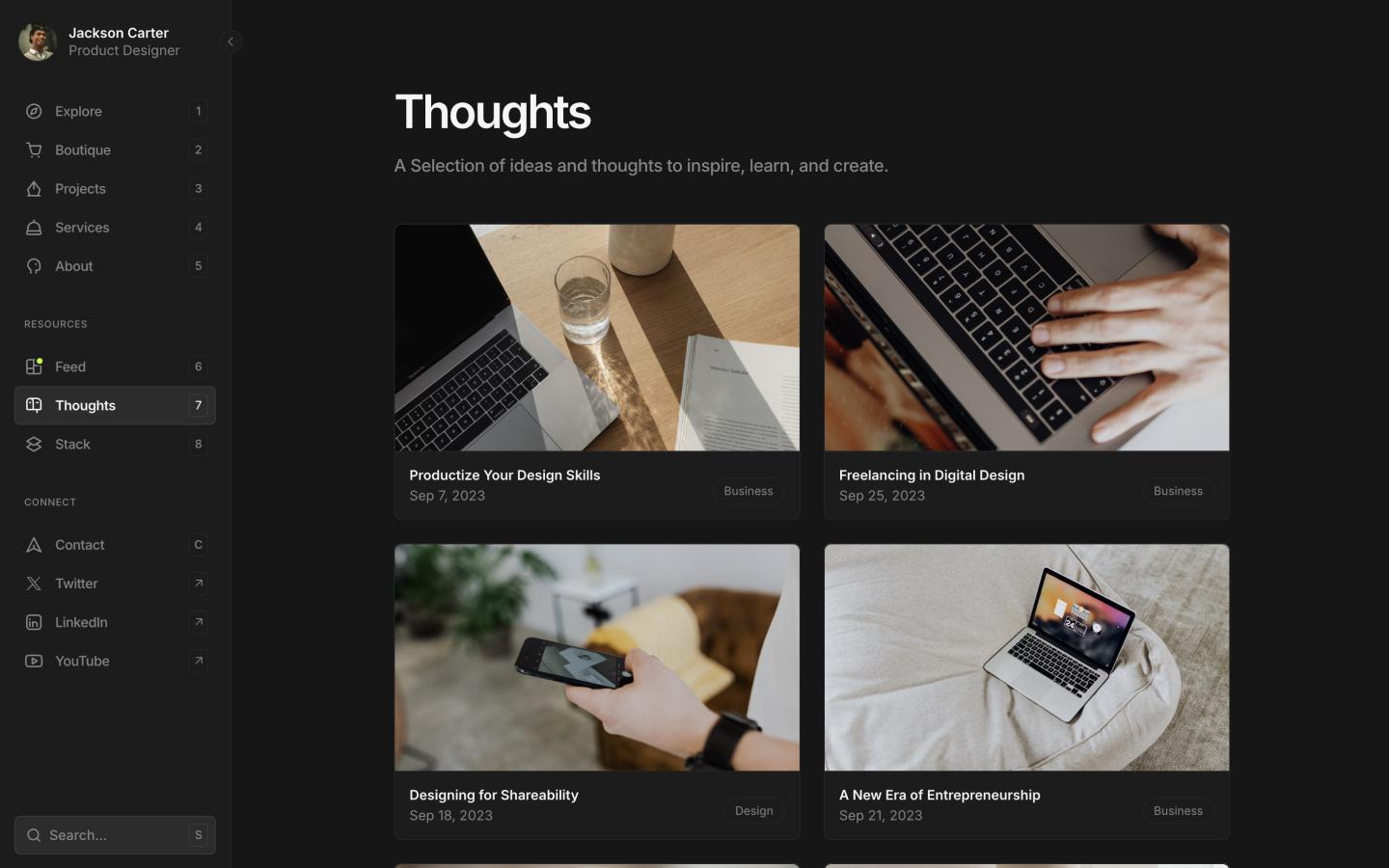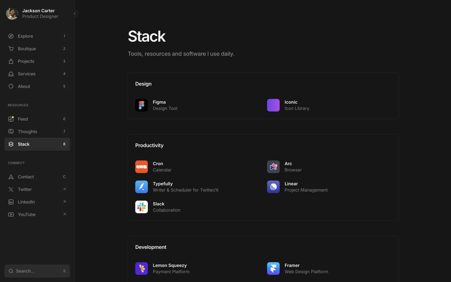 The signature sidebar, keyboard shortcuts, and auto light/dark theming aren't aesthetic choices, they're signals that tell clients and collaborators you take your work seriously. Underneath the surface is infrastructure that most creatives spend months trying to build: a content hub, a digital store, case studies, a blog, and a services page, all managed from 6 CMS collections without touching code.